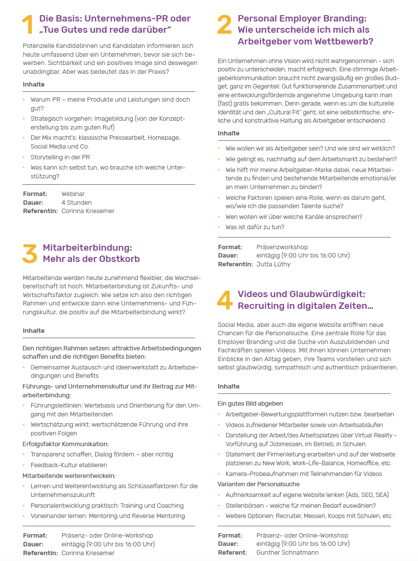 Das Feedback auf Ihre Stellenanzeigen ist mau? Es gibt einen Weg, das zu ändern. Mit 4 einzeln buchbaren Workshop-Modulen zeigen Corinna Kriesemer, Jutta Lüthy und Gunther Schnatmann, wie Sie Ihr Unternehmen zum Bewerber-Magneten machen.